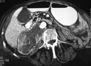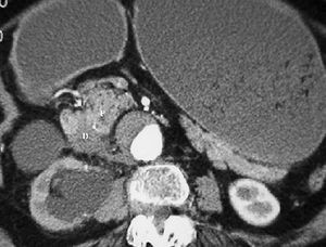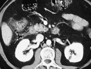 Una patología infrecuente es la fístula aortoduodenal, que se puede producir secundaria a un aneurisma de aorta en progresión o a procedimientos terapéuticos como la colocación de prótesis de aorta (fig. 15). En ocasiones puede observarse el paso de contraste de la aorta a la luz duodenal. Normalmente tiene una evolución fatal.
