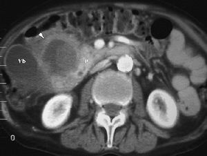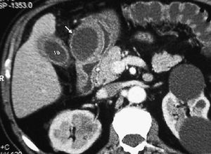 Fig. 13--Absceso en pared duodenal secundario a colecistitis. Tomografía computarizada con contraste intravenoso. Colección hipodensa (flecha) en contacto con la pared de la segunda porción duodenal, en proximidad a una vesícula con las paredes engrosadas (Vb).