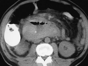 El duodeno es una localización infrecuente de diverticulitis. La imagen radiológica consiste en un engrosamiento de la pared del duodeno asociado a un divertículo, en ocasiones con un enterolito en su interior, con inflamación de la grasa adyacente16 (fig. 9).
