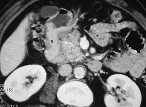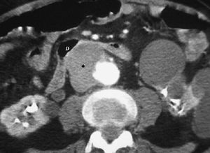 Fig. 15--Fístula aortoduodenal. Varón con hemorragia digestiva alta e imagen en tomografía computarizada con contraste intravenoso de aneurisma de aorta (*) que desplaza la luz duodenal (D) y con sangrado confirmado con endoscopia.