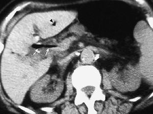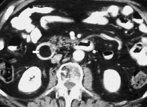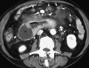 Los divertículos duodenales son prominencias saculares en contacto con la luz intestinal. Por su alta frecuencia pueden considerarse una variante de la normalidad. Se localizan principalmente en la pared medial de la segunda y tercera porción duodenales, próximos a la ampolla de Vater. Las complicaciones más frecuentes son la infección, perforación, hemorragia, pancreatitis o la obstrucción biliar. Es importante identificarlos, pues pueden dificultar la canulación de la vía biliar durante la colangiopancreatografía retrógrada endoscópica (CPRE). Ecográficamente se presentan como imágenes hiperecogénicas lineares o cóncavas, proyectadas sobre la cabeza pancreática7. En la TC se manifiestan como estructuras redondeadas o saculares, en contacto con la luz duodenal, rellenas de líquido, aire o con un nivel hidroaéreo8 (fig. 2). Cuando están rellenas de material pueden simular una masa pancreática, por lo que hay que buscar aire en su interior.