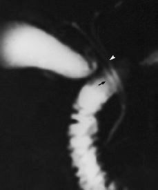 ABCFig. 9.--Páncreas divisum. A) Reconstrucción MIP a partir de secuencia HASTE en proyección coronal; se visualiza el conducto pancreático ventral (flechas) y el conducto pancreático dorsal (punta de flechas) sin conexión de ambos. B) Mismo detalle en un corte axial de una secuencia HASTE. C) En la CPRE sólo se ha opacificado el conducto ventral (flechas).