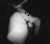 ABCFig. 8.--Conducto cístico medial. Secuencia RARE en posición coronal (A) que muestra la existencia de conducto cístico dilatado que cruza el colédoco y se implanta medialmente (flechas). En un corte axial secuencia HASTE (B) se consigue una mejor visualización del trayecto anómalo del mismo. La CPRE (C), que confirma la existencia de una implantación medial del cístico.