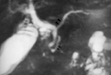 ABFig. 6.--A) Imagen obtenida mediante secuencia RARE de un grosor de 40 mm en proyección coronal oblicua que muestra ausencia de patología biliar y del conducto pancreático. Anomalía de implantación del cístico con curso paralelo mayor de 4 cm (flechas grandes). Situación extrahepática del confluente biliar (punta de flecha). B) La CPRE confirma la existencia del conducto cístico paralelo de implantación baja, sin relleno de la vía biliar intrahepática.