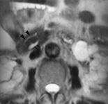 ABFig. 11.--Papila paradiverticular. A) Secuencia RARE de grosor de 35 mm coronal oblicua; el colédoco junto con el conducto pancreá-tico desembocan en segunda porción duodenal en un divertículo. Las flechas señalan el cuello del divertículo. B) La CPRE muestra los mismos hallazgos.