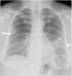Mujer de 55 años con infección por COVID-19. La radiografía posteroanterior de tórax muestra una opacidad focal periférica en campo medio derecho (flecha), una consolidación focal en campo medio/base izquierda y una opacidad lineal en la base izquierda (fleche corta). Cuantificación: 4/6 campos y 5/8 campos, que corresponden a afectación grave en sistema 6A, moderada en sistema 6B y moderada en sistema 8.