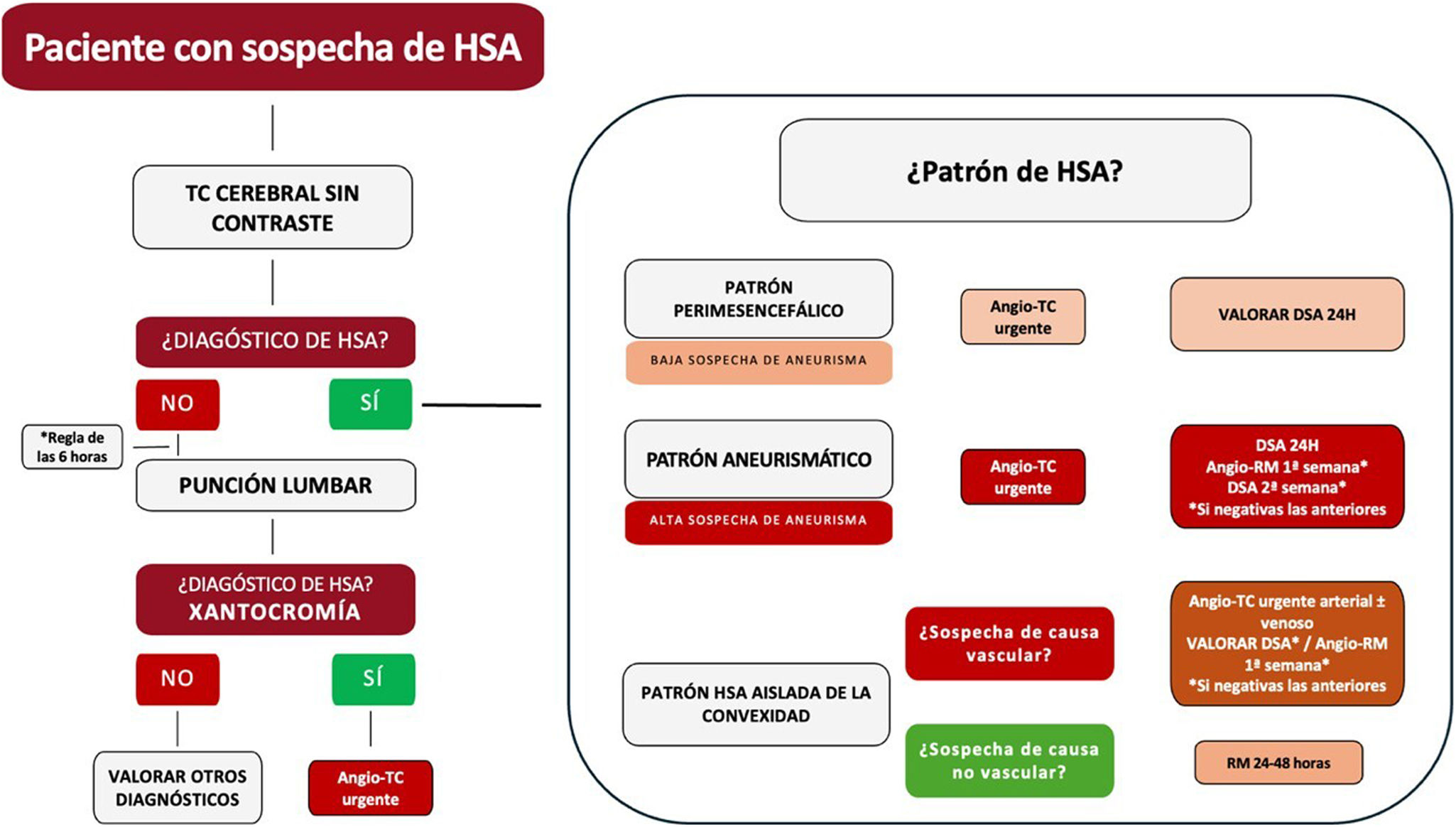 La hemorragia subaracnoidea espontánea (HSA) es una urgencia neurológica que afecta predominantemente a adultos jóvenes, con una elevada tasa de mortalidad y secuelas neurológicas graves en los supervivientes. Su manifestación clínica más característica es la cefalea súbita en trueno, considerada la peor cefalea de la vida, frecuentemente acompañada de alteraciones del nivel de conciencia y rigidez de nuca. La tomografía computarizada craneal sin contraste (TCCSC) constituye la herramienta diagnóstica inicial de elección, con alta sensibilidad. El reconocimiento de patrones de distribución del sangrado en la TCCSC permite orientar el diagnóstico etiológico y valorar la presencia de complicaciones como hidrocefalia, hemorragia intraventricular o edema cerebral. Esta primera parte del artículo proporciona una guía práctica y detallada basada en la imagen para el radiólogo en la fase hiperaguda de la HSA espontánea, diferenciando entre patrones aneurismáticos, perimesencefálicos y corticales, y discutiendo sus implicaciones clínicas, diagnósticas y terapéuticas.