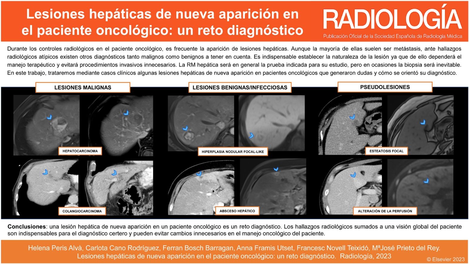 Durante los controles radiológicos del paciente oncológico, es frecuente la aparición de lesiones hepáticas. Aunque la mayoría suelen ser metástasis, ante hallazgos radiológicos atípicos existen otros diagnósticos a tener en cuenta. Los abscesos hepáticos, la hiperplasia nodular focal-like en los pacientes tratados con sales de platino o el hepatocarcinoma en pacientes cirróticos son ejemplos de lesiones que pueden aparecer en el seguimiento de estos pacientes y que no deben ser confundidas con metástasis. Es indispensable establecer la naturaleza de la lesión, ya que de ello dependerá el manejo terapéutico y evitar procedimientos invasivos innecesarios. Los estudios radiológicos previos, junto con la visión global del enfermo, serán primordiales, y aunque la RM hepática será en general la prueba indicada, en ocasiones la biopsia será inevitable. En este artículo trataremos mediante casos clínicos algunas lesiones hepáticas de nueva aparición en el paciente oncológico que pueden generar dudas diagnósticas y cómo orientar el diagnóstico.
