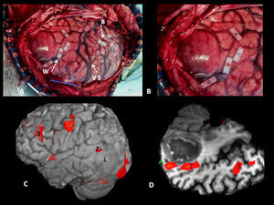 Estimulación eléctrica cortical y subcortical intraoperatoriaEn todos los pacientes se había procedido a la localización del tumor con ecografía intraoperatoria, bajo anestesia local, delimitando los bordes y marcándolos con las letras A, B, C y D. El mapeo con estimulación eléctrica cortical comenzó en el córtex sensitivomotor, alrededor del surco de Rolando. Posteriormente, se procedió al mapeo del lenguaje, con diferentes paradigmas (verbalización, nominación de objetos, lectura de un texto). La intensidad de la estimulación eléctrica osciló entre 1-2mA, hasta un máximo de 8mA, que induce crisis. La estimulación se consideró positiva si se producía una alteración en el discurso verbal tras 3 estimulaciones seguidas en un área de 0,5×0,5cm. Esta se marcaba con etiquetas blancas numeradas. En un segundo tiempo se procedió a la resección de la lesión, llegando a la región subcortical. La estimulación eléctrica de estos haces subcorticales ocasionó alteraciones del lenguaje similares a las áreas corticales. En este momento se siguieron los haces funcionales subcorticales ya mapeados desde su origen cortical y se continuó con la resección hasta que los haces subcorticales elocuentes rodeaban la cavidad quirúrgica.