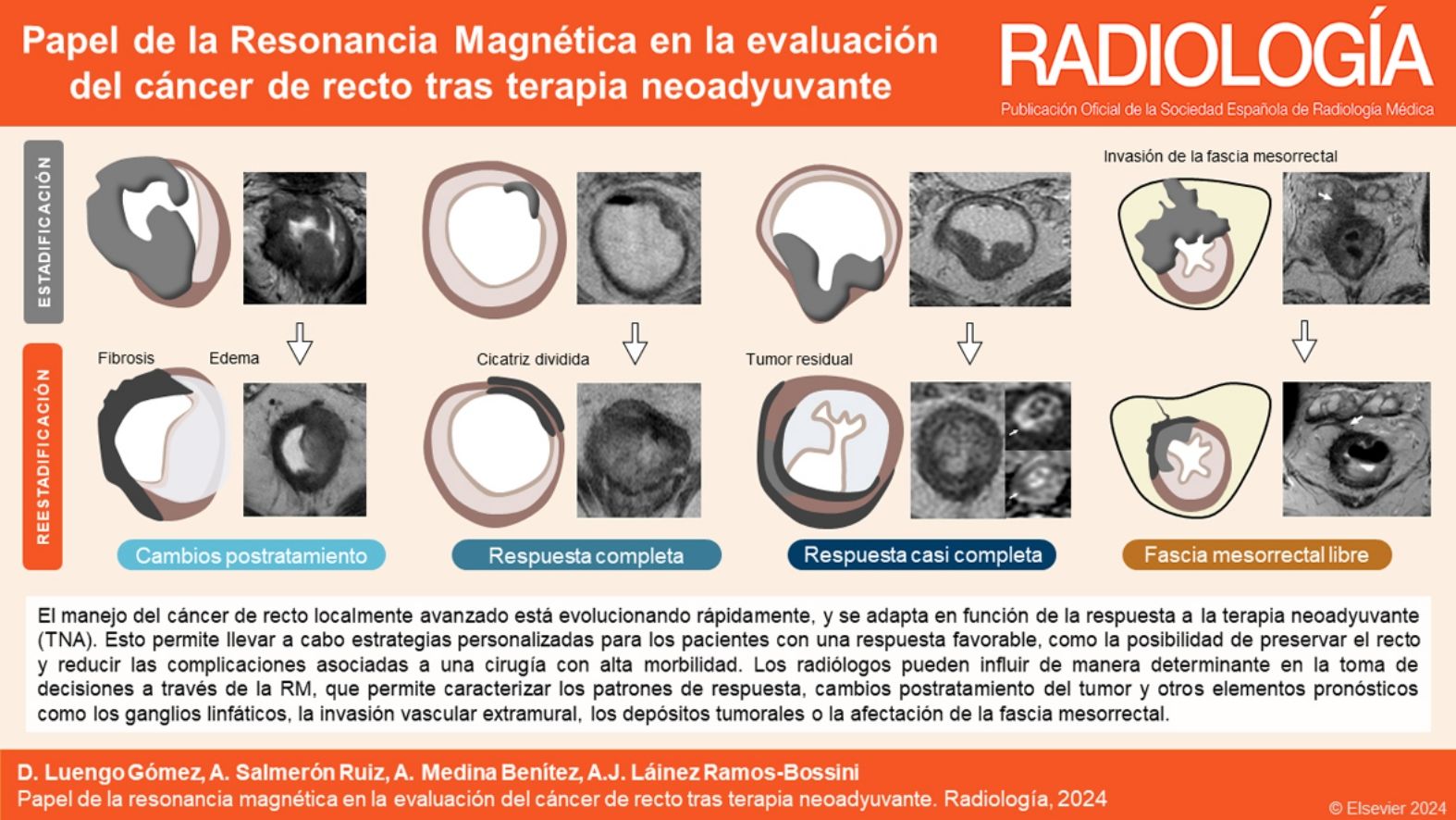 El manejo del cáncer de recto localmente avanzado (CRLA) está evolucionando rápidamente, y se adapta en función de la respuesta a la terapia neoadyuvante (TNA). Esto permite llevar a cabo estrategias personalizadas para los pacientes con una respuesta favorable, como la posibilidad de preservar el recto y reducir las complicaciones asociadas a una cirugía con alta morbilidad. Los radiólogos pueden influir de manera determinante en la toma de decisiones a través de la resonancia magnética (RM), que permite caracterizar los patrones de respuesta, cambios postratamiento del tumor y otros elementos pronósticos como los ganglios linfáticos, la invasión vascular extramural (IVEM), los depósitos tumorales o la afectación de la fascia mesorrectal (FMR). Sin embargo, los hallazgos radiológicos pueden resultar difíciles de interpretar, por lo que es necesario un profundo conocimiento de los mismos, así como de las limitaciones actuales de la RM. En esta revisión abordamos los fundamentos que apoyan el cambio de paradigma hacia las estrategias de organopreservación, el papel y los desafíos actuales que presenta la RM en la reestadificación del cáncer de recto tratado con TNA.