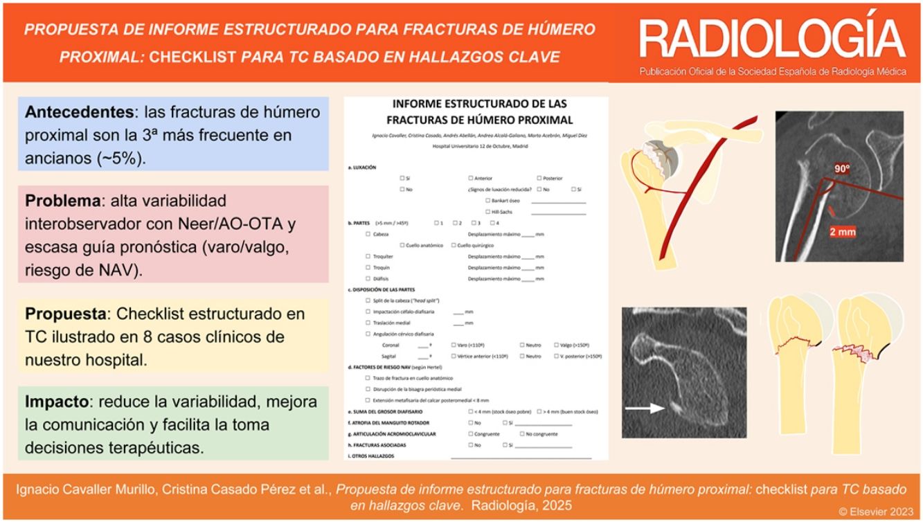 Las fracturas de húmero proximal (FHP) representan una patología frecuente, especialmente en adultos mayores, y su adecuado manejo depende en gran medida de una correcta caracterización radiológica. Aunque las clasificaciones de Neer y AO/OTA son las más utilizadas, ambas presentan limitaciones relevantes que pueden comprometer la precisión diagnóstica y la toma de decisiones terapéuticas. Este trabajo propone un modelo de informe estructurado para estudios de tomografía computarizada (TC) en FHP, basado en un checklist que integra parámetros clave —como el tipo de fractura, su disposición y el riesgo de necrosis avascular (NAV)—, e ilustrado con ocho casos clínicos de nuestra institución. Este enfoque busca reducir la variabilidad interobservador, mejorar la comunicación con los traumatólogos y favorecer un tratamiento más eficaz.