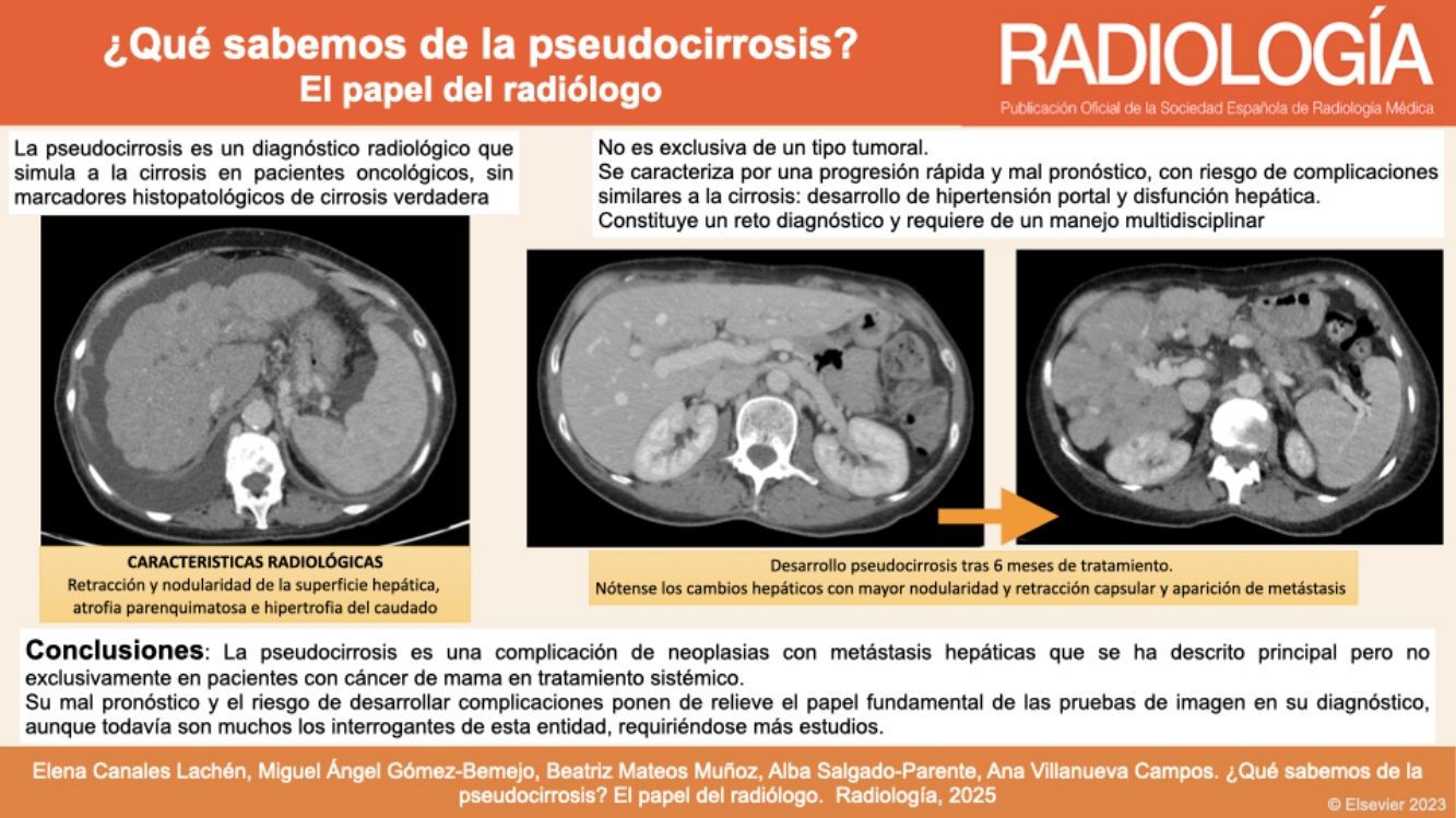 La pseudocirrosis es un diagnóstico radiológico que refleja alteraciones morfológicas hepáticas que simulan la cirrosis en los pacientes oncológicos, sin marcadores histopatológicos de cirrosis verdadera. Su diagnóstico, basado casi exclusivamente en pruebas de imagen, tiene una importante implicación pronóstica, ya que aumenta la morbimortalidad y el riesgo de desarrollar encefalopatía, hemorragia por varices esofágicas/gástricas o insuficiencia/fallo hepático. No obstante, a pesar de su trascendencia, todavía son muchos los interrogantes sobre la fisiopatología, los factores predisponentes y el manejo de esta entidad.
