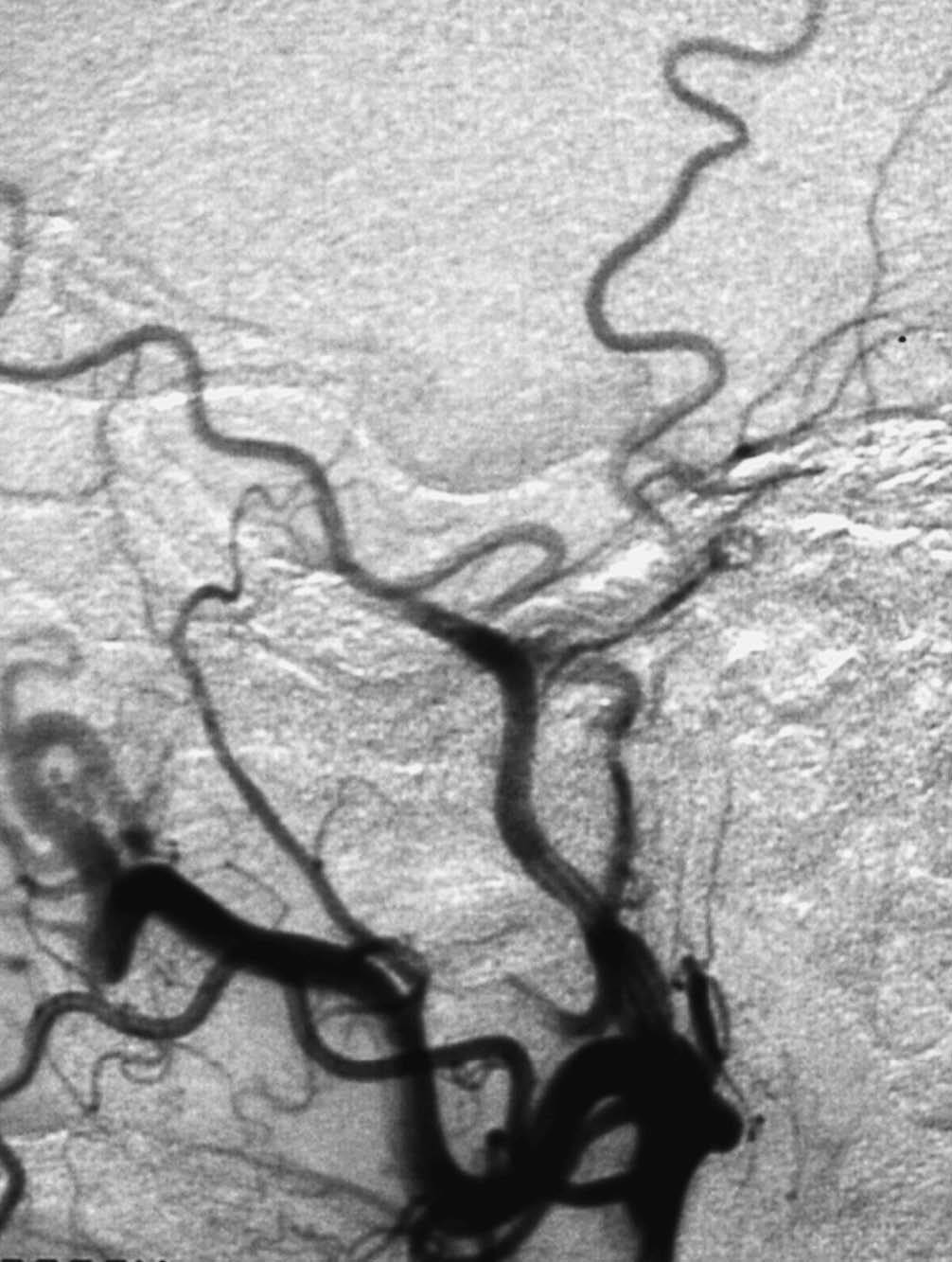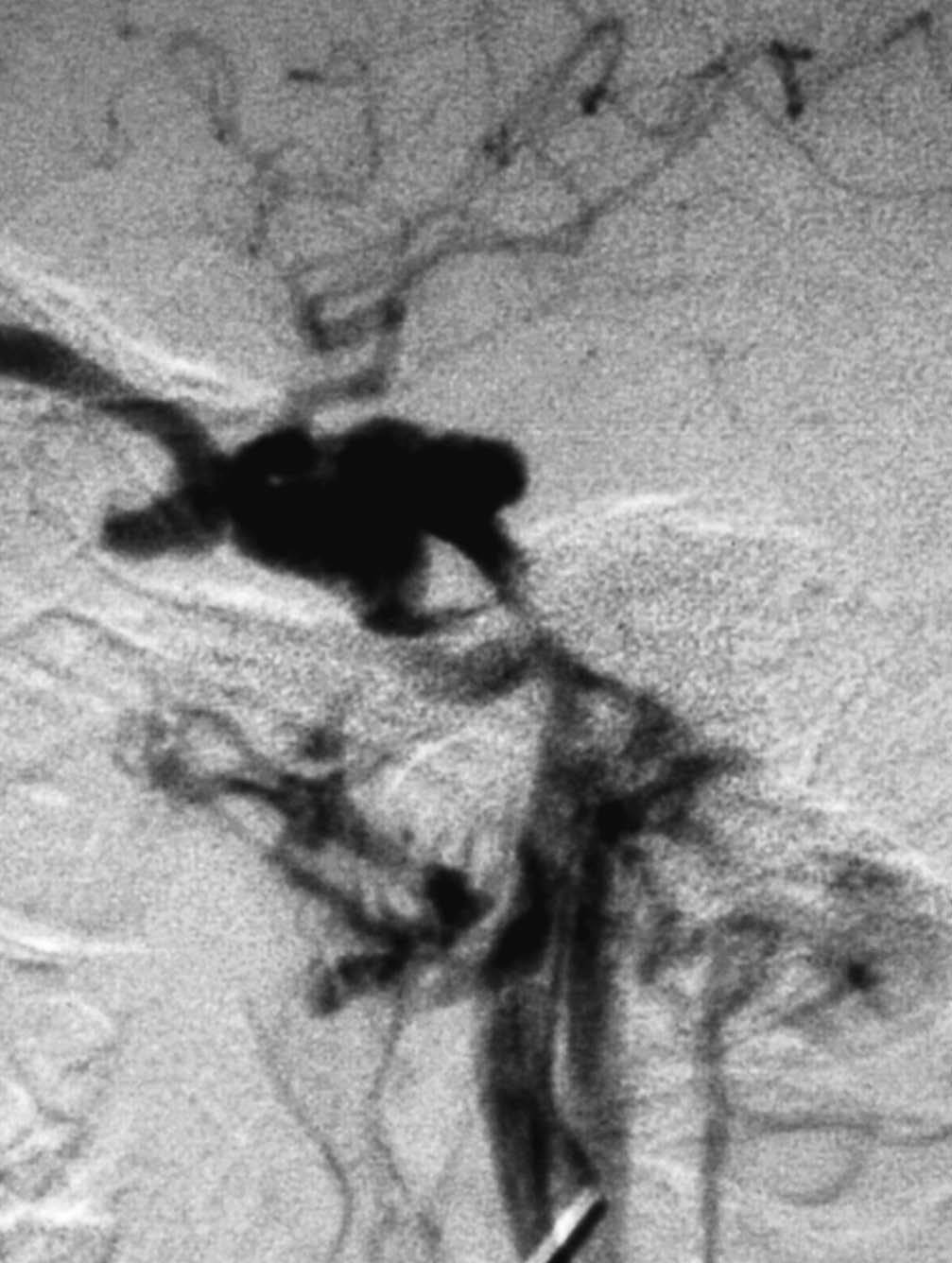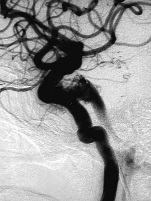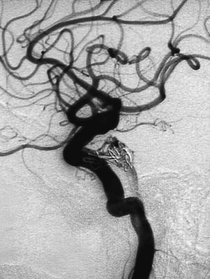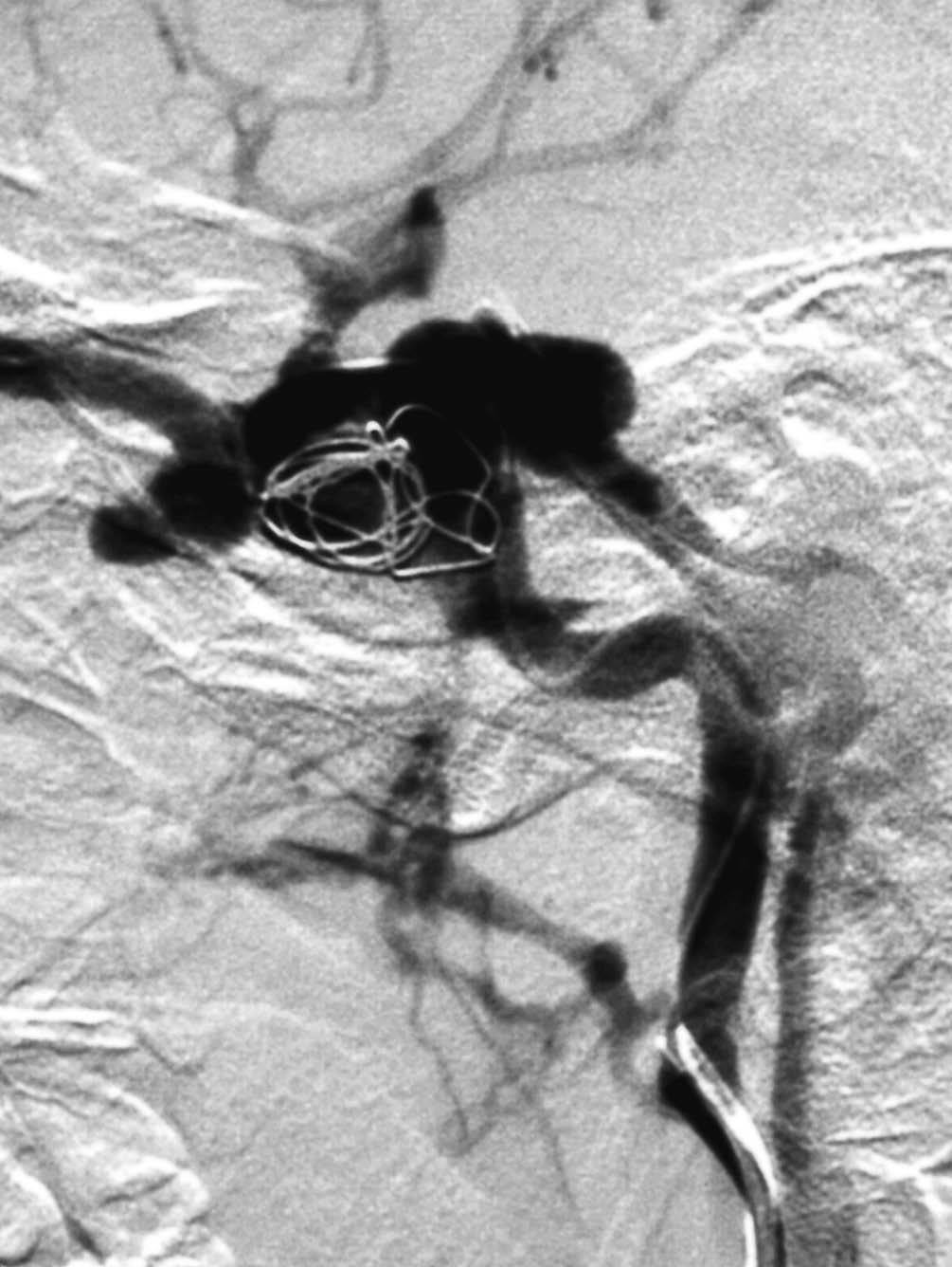 En los casos en los que el tratamiento conservador no ha sido eficaz10, cuando existen manifestaciones clínicas o angiográficas que asocian mal pronóstico, que ya hemos comentado, está indicada la terapia endovascular. La vía de abordaje puede ser arterial o venosa. Inicialmente se prefería la colocación de balones por vía arterial27-29. Con este procedimiento se conseguía cierre de la fístula con preservación de ACI casi en el 90% de los casos, sin embargo la tasa de complicaciones mayores era del 5%, consistiendo en isquemia cerebral transitoria e infartos tromboembólicos o isquémicos30. Los pseudoaneurismas post-tratamiento aparecían hasta en un 44% de los casos y se debían al hueco dejado por el desinflado del balón, pero su trascendencia clínica era escasa28,31. Hoy en día este procedimiento ha sido sustituido por otros gracias al desarrollo y empleo de nuevos materiales y/o vías de abordaje32. Se prefieren los coils en la práctica habitual (fig. 4).