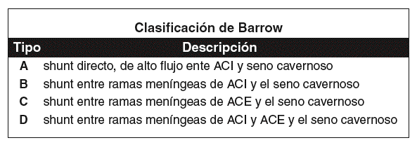 Las fístulas carótido-cavernosas (FCC) son comunicaciones arteriovenosas anómalas entre la arteria carótida interna (ACI) y/o la carótida externa (ACE) o sus ramas y el seno cavernoso. Estas comunicaciones anómalas pueden ser consecuencia de un trauma que origina una brecha en la porción intracavernosa de la ACI. Se produce una fístula directa, de alto flujo, que típicamente se manifiesta como exoftalmus pulsátil asociado a alteraciones oculares. Otro tipo de FCC son en las que se producen, de forma espontánea, comunicaciones entre ramas intracavernosas de la ACI y/o ramas durales de la ACE con el seno cavernoso. Son fístulas durales o indirectas, de bajo flujo1-3. La clasificación más extendida es la de Barrow (fig. 1), en función de la morfología de la FCC pero con implicaciones funcionales y por tanto terapéuticas4. La presentación típica de las fístulas de localización carótido-cavernosa es el exoftalmus pulsátil y puede asociar otras alteraciones oculares. La mayoría de los síntomas y signos se deben a la alteración del drenaje venoso. Cuando se produce una comunicación arteriovenosa anómala en el seno cavernoso se invierte el flujo en las venas oftálmicas, aumenta la presión intraluminal y el seno cavernoso y las venas pueden dilatarse y elongarse. Como resultado, se produce exoftalmus, quemosis o edema conjuntival, aumento de la presión intraocular y glaucoma secundario con pérdida de la agudeza visual, que suele ser transitoria5-7.