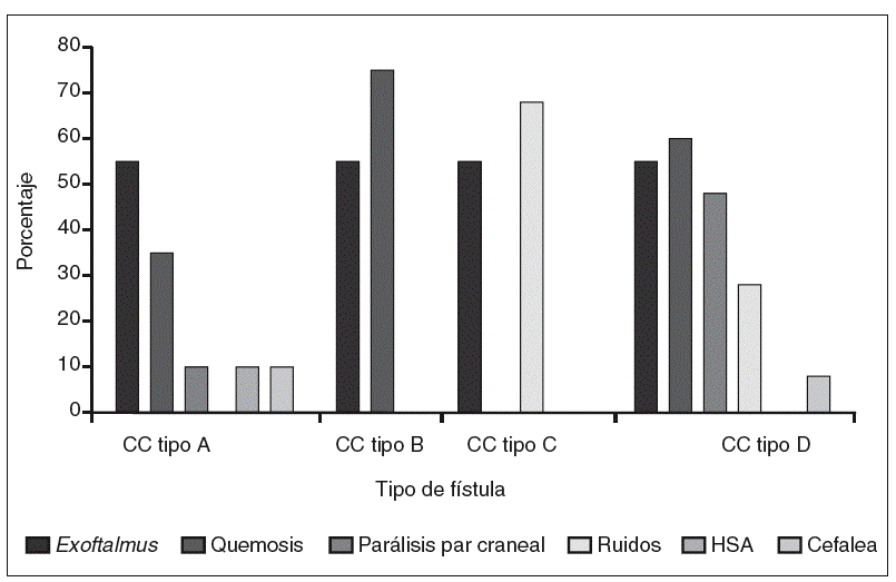 Con la finalidad de comparar la presentación clínica según el tipo de fístula, en la figura 2 se presentan los síntomas en porcentajes relativos dentro de cada grupo. Así comprobamos que la clínica es bastante similar. Cabe resaltar que las FCC tipo C y D pueden manifestarse como acúfenos y que en el caso de las FCC tipo A el exoftalmus y la quemosis son más llamativos.