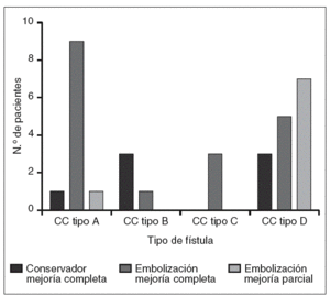 En lo referente al análisis, de forma global, del tipo de tratamiento y sus resultados, de los 33 pacientes diagnosticados mediante arteriografía de FCC, el 21% fueron tratados de forma conservadora y el 79% se sometieron a terapia endovascular. La evolución clínica de los pacientes fue la siguiente: en el 76% desaparecieron los síntomas, mientras que el 24% de los pacientes experimentaron una mejoría parcial. La evolución clínica en dependencia del tratamiento y el tipo de FCC según la clasificación de Barrow se resume en la figura 3.