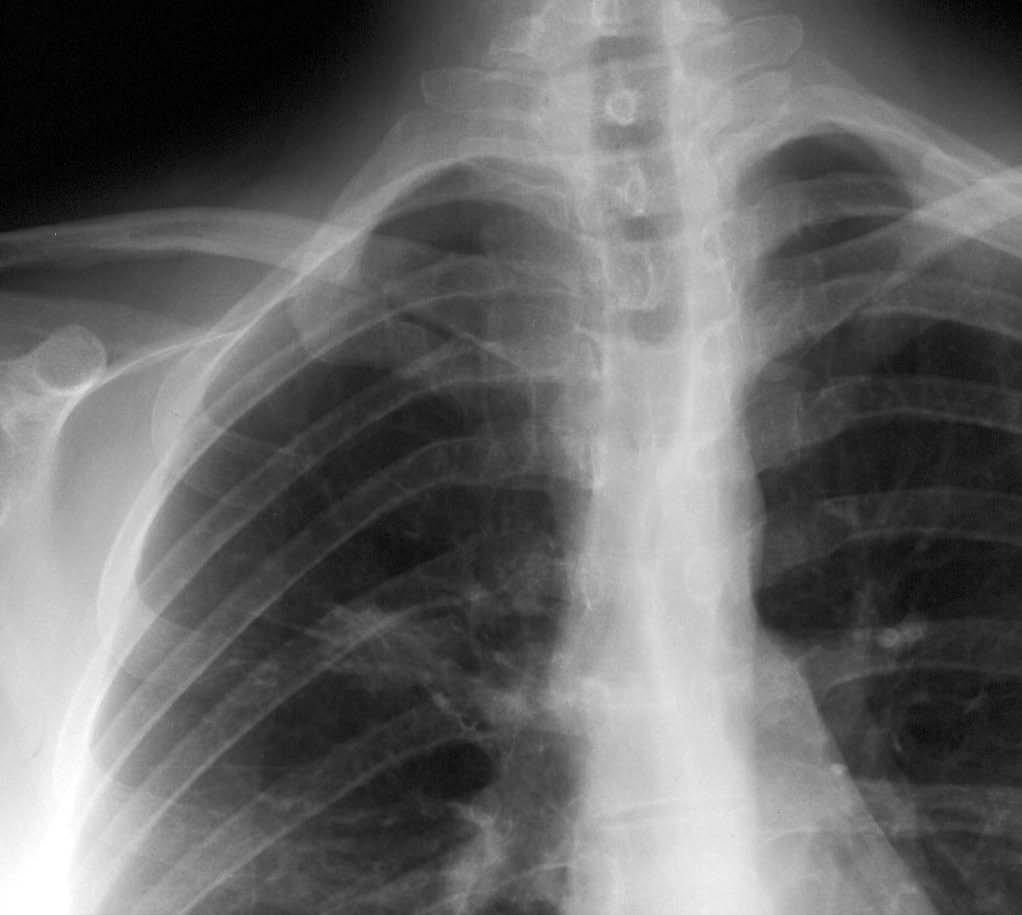 Fig. 1.--Detalle ampliado de radiografía de tórax póstero-anterior en la que se visualiza un nódulo de contornos mal definidos en el lóbulo superior derecho.