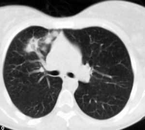 Mujer de 26 años de edad, fumadora de 10 cigarrillos al día, sin otros antecedentes de interés, que consulta por dolor torácico pleurítico sin fiebre, ni otra sintomatología acompañante. Las pruebas de laboratorio fueron normales. En la radiografía de tórax se observó una lesión redondeada de unos 3 cm en el lóbulo superior derecho, parahiliar (fig. 1). Ante la posibilidad de que se tratara de una neumonía redonda, recibió tratamiento antibiótico empírico con amoxicilina-clavulánico, sin cambios radiológicos. Se realizó una tomografía computarizada (TC) torácica sin contraste intravenoso, que mostró un nódulo pulmonar de bordes mal delimitados de 2 x 3 cm en el segmento anterior del lóbulo superior derecho, con tres nódulos satélites adyacentes (figs. 2 y 3). La fibrobroncoscopia fue normal. La citología del broncoaspirado y cepillado bronquial fue negativa para malignidad. Los cultivos para bacterias, hongos y micobacterias resultaron estériles. Se practicó una punción aspiración con aguja fina (PAAF) transtorácica bajo control con TC, obteniéndose material sin evidencia de malignidad. Ante la ausencia de diagnóstico y la imposibilidad para descartar malignidad se realizó una lobectomía superior derecha.