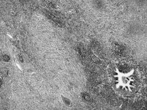 El lóbulo superior derecho medía 15 x 10 x 10 cm, conteniendo una tumoración de 4 cm de diámetro, amarillenta, que infiltraba focalmente el parénquima adyacente, sin alcanzar el borde pleural. Los ganglios linfáticos, tanto del hilio como traqueobronquiales y subcarinales eran normales. El tumor estaba compuesto por un tejido fibroso infiltrado por linfocitos y células plasmáticas. Focalmente había numerosos histiocitos xantomizados. Las áreas fibrosas adoptaban un patrón estoriforme. No se observó necrosis y el número de mitosis fue muy bajo. Periféricamente el parénquima pulmonar quedaba atrapado por la tumoración, no observándose cápsula. En estas zonas predominaba un infiltrado rico en linfocitos formando folículos linfoides. La inmunohistoquímica descartó la presencia de vimentina y actina (fig. 4).