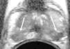 Anatomía en corte axial, secuencia ponderada en T1. A) Señal isointensa difusa normal de la glándula sin diferenciar zona central o periférica, y algunas zonas más hiperintensas de adenoma sin traducción patológica (flecha). B) Señal hiperintensa en ambos lóbulos periféricos secundaria a hemorragia postbiopsia (flechas) con asimetría del plexo neurovascular de causa no infiltrativa.