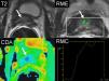 Prostatitis crónica. Paciente de 45 años con PSA de 17ng/ml. Imagen axial en T2 mostrando hipointensidad de forma parcheada en la zona periférica bilateral de márgenes regulares. La secuencia RME muestra picos de la colina elevados con el cociente [(colina+creatina)/citrato] (CCo/Ci) elevado. El mapa paramétrico no muestra valores bajos del CDA, y no hay áreas focales de color azul. La secuencia de RMC muestra hipervascularización bilateral en las zonas de posible sospecha mostradas en la imagen axial en T2, de predominio en la derecha1. El estudio histológico mostró prostatitis crónica en todos los cilindros de la biopsia.