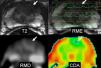 Cáncer de próstata central y periférico. La secuencia con contraste dinámico, RMC, muestra el mapa paramétrico (flecha) con realce intenso en los primeros segundos traducido con el color amarillo y el lavado rápido traducido con el color rojo en la curva de intensidad/tiempo. Las secuencias funcionales de RME muestran elevación de la colina (flecha blanca) y valor bajo de CDA en el mapa paramétrico de color azul (flecha negra).