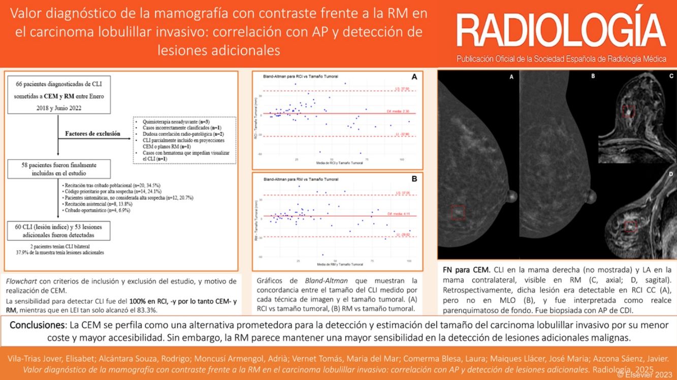 Materiales y métodosEstudio retrospectivo observacional, unicéntrico, que incluyó a aquellas mujeres con diagnóstico histológico de CLI, sometidas a CEM y RM preoperatorias entre enero de 2018 y junio de 2022. Se evaluó la capacidad de detección del CLI mediante imágenes de baja energía (LEI), recombinadas (RCI), CEM (LEI + RCI) y RM para el CLI. Se analizó la correlación entre el tamaño tumoral estimado por cada técnica respecto a la anatomía patológica (AP), así como la de la visibilidad con el grado tumoral. Asimismo, se valoró la detección de lesiones adicionales (LA).