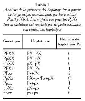 Se dividieron las mujeres según presentaran o no el haplotipo Px. Se excluyeron del análisis las que tenían un genotipo ambiguo que no permitía identificar el haplotipo con seguridad (tabla 1).
