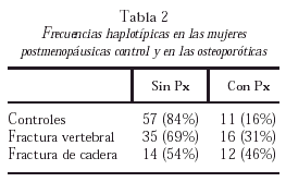 Sin embargo, el haplotipo Px tendió a ser más frecuente en las mujeres con fracturas que en las controles (tabla 2), aunque sólo alcanzó significación estadística en el caso de las fracturas de cadera (p = 0,03). La odds ratio de la asociación entre la presencia del haplotipo Px y las fracturas de cadera fue de 2,7 (IC 95% 1,1-6,9).