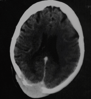 Se observan en las imágenes lesiones osteolíticas en región frontal medial, parietal izquierda y parietoocipital derecha, teniendo en esta última localización tejido sólido suprayacente (figs. 1 y 2). Esta lesión sólida parece erosionar todo el diploe y ambas tablas interna y externa, y extenderse al espacio epidural y muy probablemente invade el seno sagital superior. Esta lesión capta contraste.