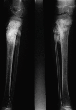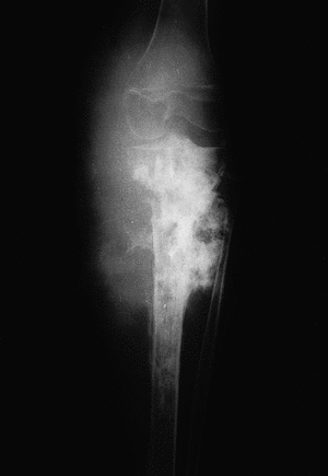 En la segunda placa (fig. 2) tomada seis meses después, se objetiva un franco avance de la lesión: el área de esclerosis atraviesa ya la placa metafisaria, extendiéndose también hacia la diáfisis. Existen lesiones líticas destructivas más evidentes en el borde medial de la tibia, perdiéndose en algunas zonas la continuidad de la cortical. Se ve un importante crecimiento de la masa de partes blandas con áreas de osificación.