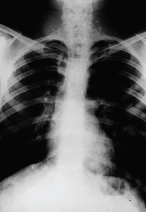 En este momento de la lesión, existen también en la placa anteroposterior de tórax (fig. 3) múltiples imágenes nodulares, fundamentalmente en pulmón izquierdo, indicativas de metástasis pulmonares y que parecen tener una alta densidad sugerente de osificación de las mismas, pues se trataría de células de la misma estirpe ósea que las del tumor primario.