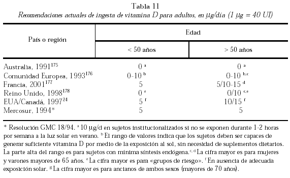 Aunque las nuevas DRI para la vitamina D en los adultos son de 5 μg (200 UI) por día, las recomendaciones beneficiosas están más cercanas a los 10-12,5 μg (800-900 UI) por día, sobre la base de los estudios de mediciones de la densidad ósea y la prevención de las fracturas en los ancianos. Por esta razón las DRI han aumentado las recomendaciones para los mayores de 70 años a 600 UI por día194 (tabla 11).