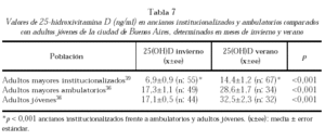 En nuestro país, estudios realizados en ancianos institucionalizados de la ciudad de Buenos Aires (edad promedio: 81,9 años) revelan grave deficiencia de los niveles de vitamina D en invierno e insuficiencia en verano155. En la población ambulatoria de la misma ciudad (edad promedio: 71,8 años) comprobamos deficiencia de vitamina D en 14,5% de la población (en invierno), y valores de entre 10 y 19 ng/ml en el 51%. En verano solamente el 20,5% de los estudiados superaban el valor de 40 ng/ml. Se comprobó hiperparatiroidismo secundario en un 28 y 20% de los sujetos con hipovitaminosis D (en invierno y verano, respectivamente)152. Si bien nuestros promedios de 25-hidroxivitamina D coinciden con el estudio EPIDOS, los niveles de deficiencia son menores. Esto puede adscribirse a la latitud geográfica de Buenos Aires (34° S), y al clima menos riguroso, que predispone a más salidas fuera de las viviendas. En Buenos Aires la fotoconversión de vitamina D es continua en todo el año, aunque con menor intensidad en invierno (tabla 7).