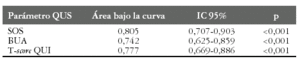 Resultados: A partir de las mediciones con DXA y siguiendo los criterios de la OMS, el 53% de los pacientes tenía osteopenia y el 17% tenía osteoporosis. Se observó correlación significativa entre los parámetros QUS (BUA, SOS y QUI) con la BMD mediante DXA (r=0,35-0,44; p<0,001). Mediante curvas ROC se estudió la utilidad de la QUS para identificar a los pacientes con osteoporosis densitométrica (tabla). Para obtener la máxima sensibilidad (5% de falsos negativos), el punto de corte del T-score QUI debe situarse en -0,6 DE, siendo la especificidad en este punto de 42%. Para minimizar los falsos positivos (5%) el punto de corte debería situarse en -2,1 DE.