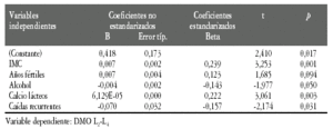 Conclusiones: El IMC y la ingesta de calcio de los lácteos son los principales factores predictivos de la masa ósea lumbar. La ingesta de alcohol y el número de años fértiles pueden ser factores secundarios. Además, encontramos asociación entre las caídas recurrentes y la masa ósea.