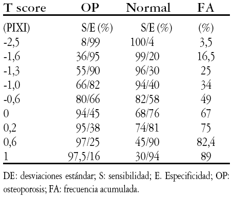 Resultados: La edad media del grupo estudiado era de 58 + 9 años. El 29% tenían osteoporosis, el 47% osteopenia y el 24% eran normales según los resultados obtenidos en cadera y/o columna. El resumen de resultados de las curvas ROC de sensibilidad y especificidad para osteoporosis y normalidad del PIXI se muestran en la tabla.