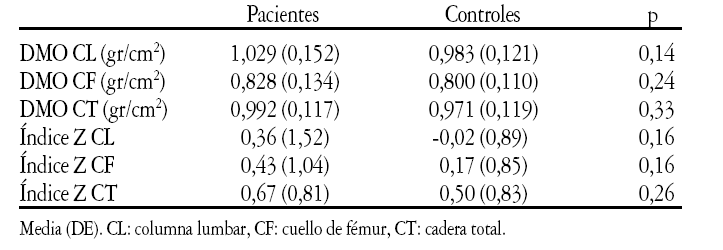 Resultados: Los valores de DMO, el peso y el IMC se recogen en la tabla.