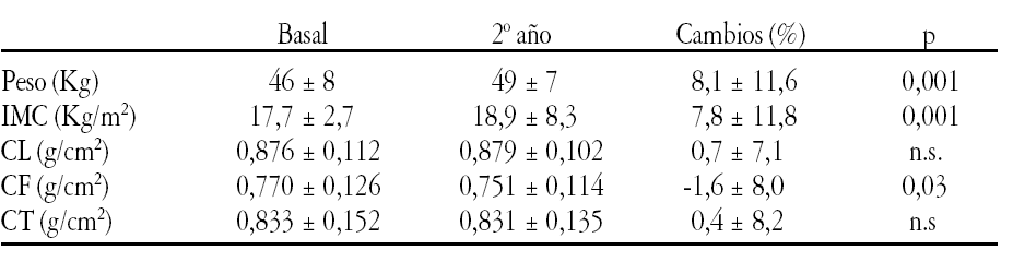 La prevalencia de osteopenia y osteoporosis no varió a lo largo del seguimiento (basal: 51% y 17%, respectivamente; 2º año: 61% y 14%, respectivamente). El aumento de peso y del IMC no guardó relación con los cambios observados en la DMO.