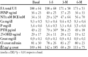 El criterio principal de valoración fue la proporción de pacientes en los que se obtuvo una respuesta terapéutica y el cambio porcentual de los marcadores de remodelado óseo, respecto a los valores basales observados a los 6m y posteriormente cada 6 meses durante 4 años.