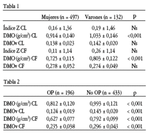 Resultados: La T media de las mujeres con osteoporosis fue -1.85 y la Z -0,95. La T de mujeres con osteopenia -0,91 y la Z -0,41. La T de mujeres normales +0,42 y la Z +0,49. La edad media de mujeres con osteoporosis fue 66 años, la de osteopenia de 60 y las normales de 56 años. La estatura fue similar en todos los grupos, sin embargo, la media de peso en mujeres normales fue de 73.6 Kg, en osteopenia de 68.3 Kg y en osteoporosis de 65.3 Kg. Se observaron 10 mujeres con antecedentes de fractura en el grupo con osteoporosis (todas ellas después delos 50 años), otras 10 en el grupo de osteopenia (5 después de los 50 años) y 8 en el grupo de mujeres normales (todas antes de los 50 años).