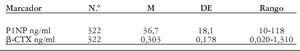 Resultados. Los valores de P1NP y β-CTX séricos -media (M), desviación estándar (DE) y rango- se recogen en la tabla 1. No se observó relación entre los valores de ambos marcadores y la edad de los sujetos. No se observaron tampoco diferencias con los valores señalados en la literatura o en el kit comercial (P1NP: 38,1 ± 18,4 ng/ml; β-CTX: 0,304 ± 0,200 ng/ml). Los pacientes osteoporóticos presentaron valores de ambos marcadores ligeramente superiores, sin que la diferencia fuera significativa (P1NP: 38,9 ± 19,4 frente a 34,9 ± 16,6 ng/ml; β-CTX: 0,320 ± 0,192 frente a 0,290 ± 0,166 ng/ml).