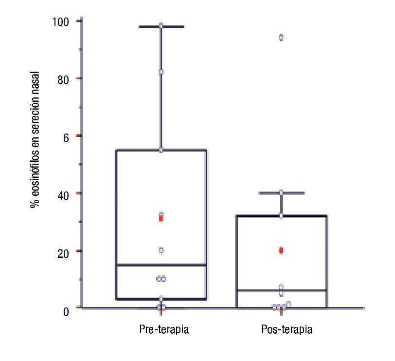 ◊ Figura 4. Porcentaje de eosinófilos en secreción nasal de pacientes al inicio (previo) y al año de la inmunoterapia (posterior).