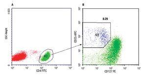 ◊ Figura 1. Los gráficos corresponden a un experimento. A- Los linfocitos CD4+ (R2) fueron seleccionados en la región de linfocitos totales (R1) identificados por sus parámetros físicos FS vs. SS (tamaño vs granularidad) (gráfico no mostrado). B- La población CD25+CD127low (R3) fue identificada y cuantificada en la región de linfocitos CD4+ (R2). El porcentaje de células TCD4+CD25+CD127low obtenido se indica sobre R3.