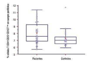 ◊ Figura 2. Porcentaje de células T CD4+CD25+CD127low de pacientes y controles. La línea media transversal del box marca la mediana.