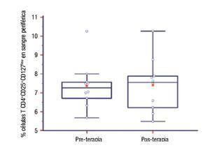 Análisis estadístico: Los datos numéricos de los grupos en estudio se expresaron como mediana y rango intercuartílico, excepto para los porcentajes de células T CD4+CD25+CD127low que se expresaron como media y desviación estándar. Se usó la prueba de Mann-Whitney para la comparación entre dos grupos independientes, y para las muestras pareadas la prueba de Wilcoxon o la prueba t-pareada según correspondió. La prueba exacta de Fisher se aplicó para comparar la distribución de sexos en los grupos. Para el análisis de correlación se aplicó el coeficiente r de Spearman.