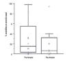 Concentración de IgE sérica total, eosinófilos periféricos y en secreción nasal y PCR ultrasensible en pacientes con inmunoterapia: Se compararon los niveles de IgE sérica, porcentajes de eosinófilos en sangre periférica y en secreción nasal, y hs-PCR sérica luego de 12.5 ± 3.47 meses de tratamiento con los valores basales en 10 pacientes. No hubo diferencia estadísticamente significativa para valores de IgE sérica (pre: 114.35 [75.23 - 338.98] vs. post: 136.1 [62.25 - 212.35]; p = 0.28), porcentajes de eosinófilos sanguíneos (pre: 7[3.5 - 7] vs. post: 4.5 [2 - 5]; p = 0.13) y concentraciones séricas de hs-PCR (pre: 0.5 [0.33 - 2.20] vs. post: 0.2 [0.1 - 1.3]; p = 0.49). En cambio, los porcentajes de eosinófilos en secreción nasal fueron significativamente menores en muestras pos tratamiento ITEA (pre: 15 [4.75 - 49.25] vs. post: 6 [0.25 - 29]; p = 0.02) (Figura 4).