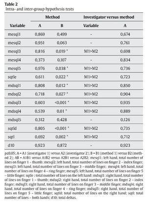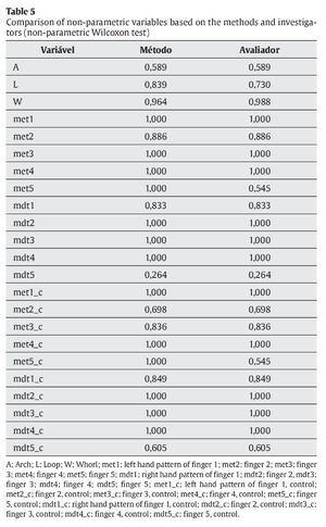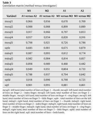 For the statistical analysis, the data are presented as the mean and standard deviation. For the inferential analysis, the Kolmogorov-Smirnov test was initially used to verify the normality of the sample in the set of observations. When the normality of the sample was confirmed, a parametric statistical test and an analysis of variance (ANOVA) were performed, which were followed by Tukey's post-hoc test to identify the possible differences between the variables, as follows: left hand, total number of lines on finger 1 - thumb (mesql1); left hand, total number of lines on finger 2 - index finger (mesql2); left hand, total number of lines on finger 3 - middle finger (mesql3); left hand, total number of lines on finger 4 - ring finger (mesql4); left hand, total number of lines on finger 5 - little finger (mesql5); total number of lines on the left hand (sqtle); right hand, total number of lines on finger 1 - thumb (mdsql1); right hand, total number of lines on finger 2 - index finger (mdsql2), right hand, total number of lines on finger 3 - middle finger (mdsql3); right hand, total number of lines on finger 4 - ring finger (mdsql4); right hand, total number of lines on finger 5 - little finger (mdsql5); total number of lines on the right hand (sqtld); total number of lines - both hands (sqtl); and total deltas (d10). The non-parametric Wilcoxon test for paired samples was used for images of the following fingerprints because they did not show a normal distribution: Arch (A); Loop (L); Whorl (W); left hand pattern of finger 1 (met1), finger 2 (met2), finger 3, (met3), finger 4 (met4) and finger 5 (met5); and right hand pattern of finger 1 (mdt1), finger 2 (mdt2), finger 3 (mdt3), finger 4 (mdt4) and finger 5 (mdt5). To observe the correlation between the computerized and the traditional system, Pearson's correlation was used. Student's paired t-test was used to evaluate the reproducibility of both methods, with the aim to compare the internal variation based on the two measurements obtained by two investigators for the same observation. For this purpose, the squared difference was considered as the analytical value according to the following mathematical model: