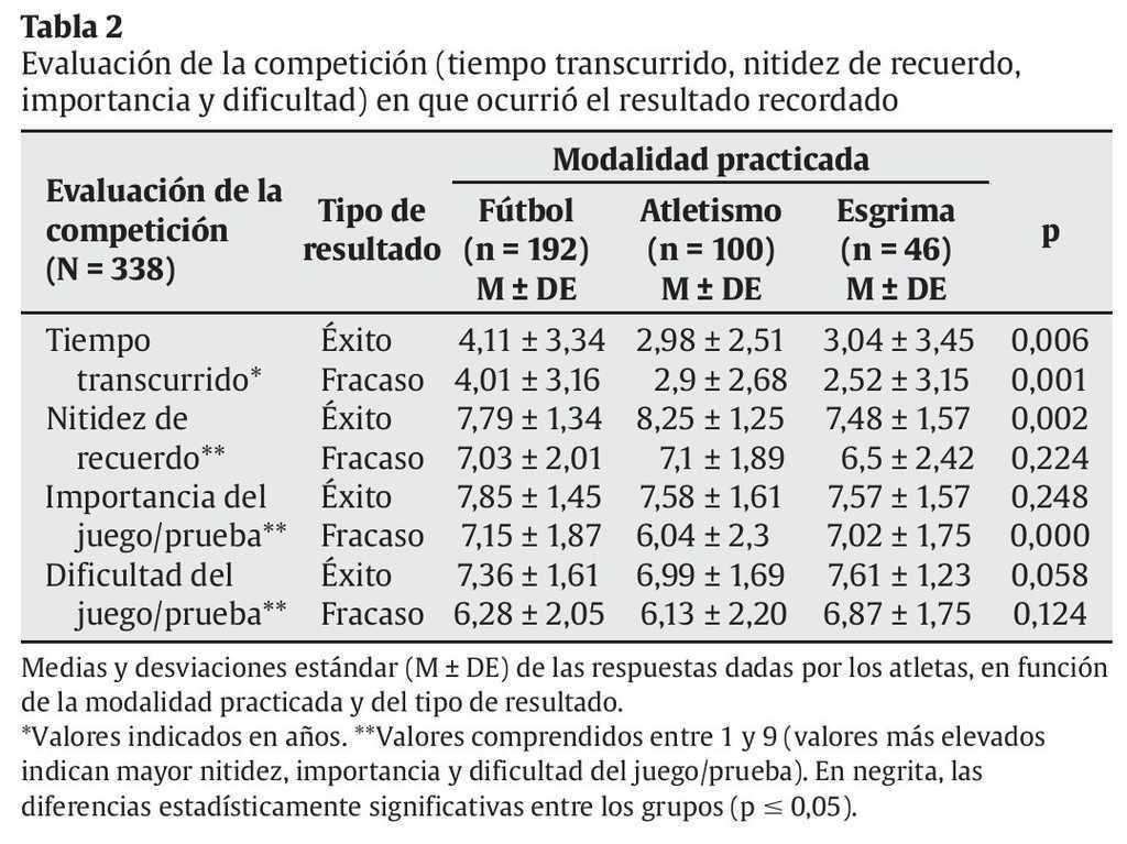Específicamente, cuando se comparan los tres grupos entre sí, en lo que respecta a la nitidez de recuerdo del mejor resultado, se verifica que en dos de los pares existe heterogeneidad en los resultados obtenidos: los casos del atletismo cuando se comparan con el fútbol (dif. = 0,464, p = 0,016) y con la esgrima (dif. = 0,772, p = 0,004), siendo el atletismo el que asocia valores estadísticos significativamente mayores que los otros, en la evaluación de esta dimensión.