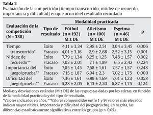 En los restantes parámetros evaluados se verificó la homogeneidad entre los grupos estudiados. En la tabla 3 se presentan los valores correspondientes al modo como los atletas caracterizan los resultados obtenidos.